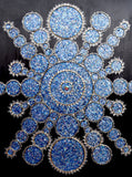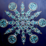 A stunning multi dimensional piece that embodies LIGHT...as a feather. A piece that evokes feelings of the earth, water and forrest....a piece adorned with golden fans and inlayed with real feathers.